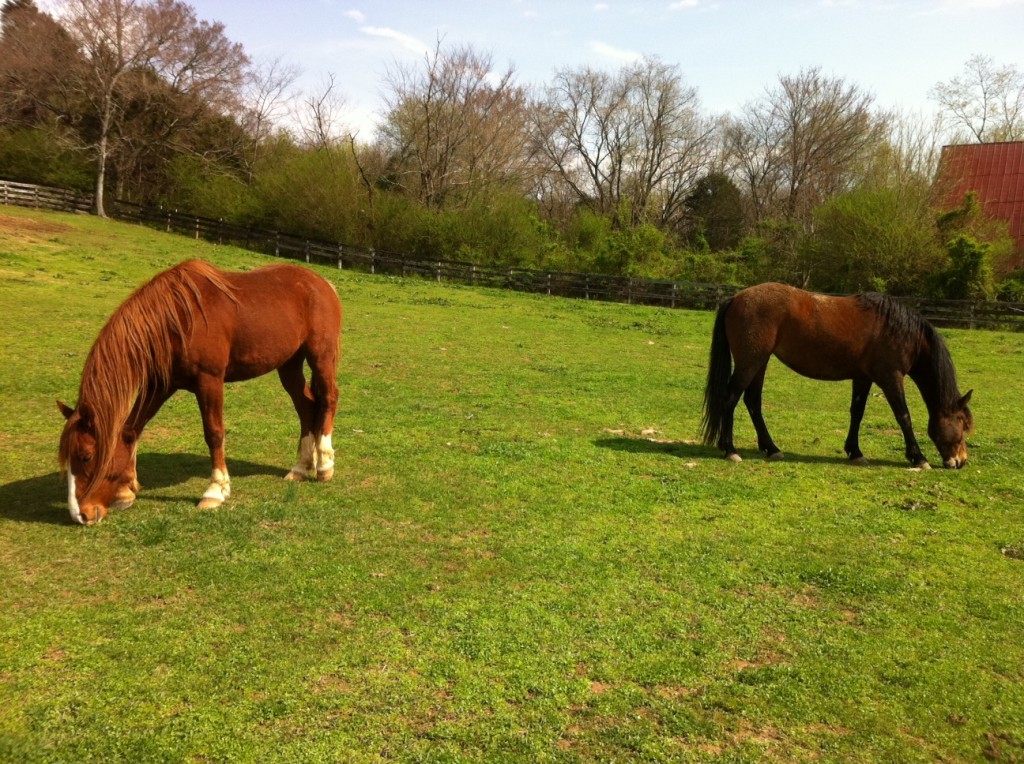 I am so excited to welcome “Applejack” (left) and “Bella” (right) to the Green Barn! These 6-year-old mustang beauties are both visiting all the way from Maine, while their owners Marianne and Jon visit the beautiful rolling hills of Tennessee! It’s so exciting for me to have the opportunity to take care of this sweet pair for the next month. I haven’t had very much (any, actually!) experience working with mustangs, especially ones that were adopted at age 3 from a free-roaming feral herd in Nevada! They are so sweet, and so well behaved. Natural horsemanship training has definitely worked its magic!!